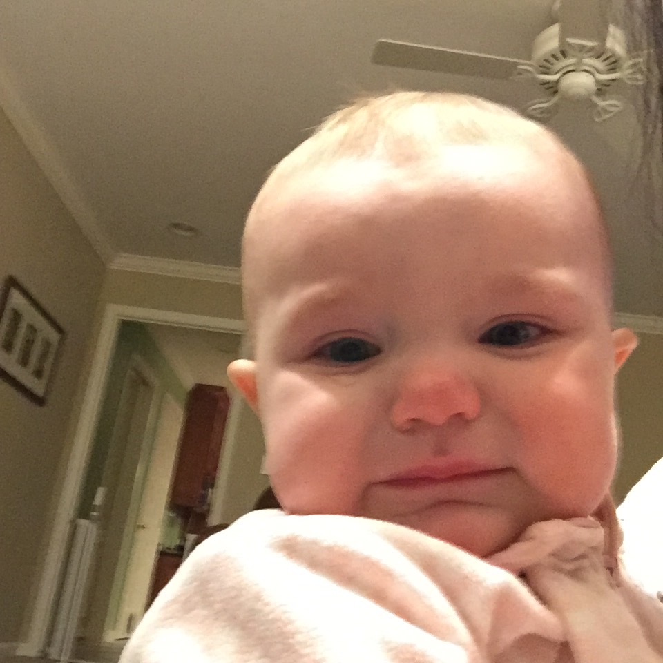 You say dadda, mama, and up (according to daddy). You wave, stick out your tongue at us, and are very close to pulling yourself up to stand. You can stand while holding onto a table for short periods of time if we prop you up. You seem to love baths and music class. We find that you crawl around to all the families and like to watch Ms. Alisa.